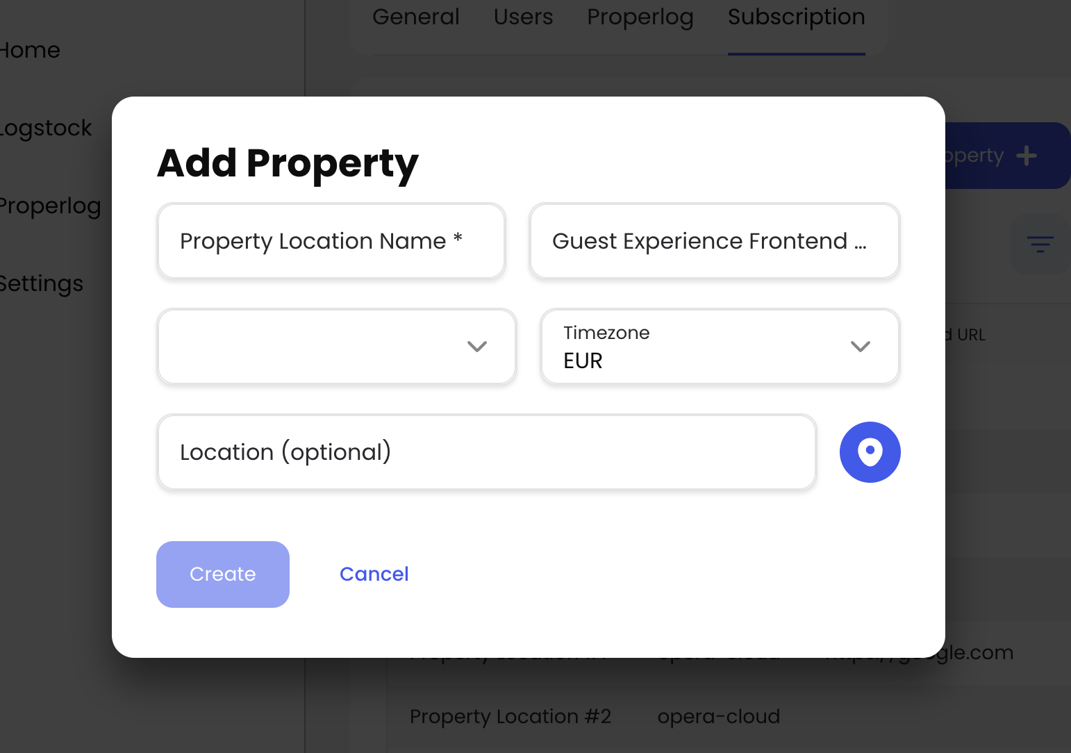 A pop-up will appear, fill the inputs and click the location input to select your property's location.